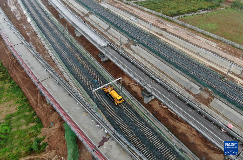 10月11日,中铁一局施工车辆在西康高铁西安东站至牛背梁站区间铺设无缝钢轨(无人机照片)。