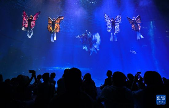 10月18日,游客在海南海洋欢乐世界度假区观看水下表演。