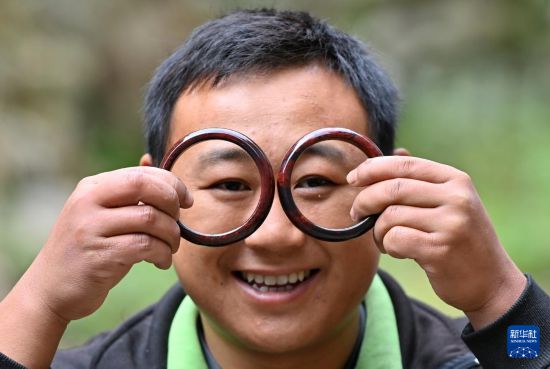 10月21日,在广西龙胜各族自治县三门镇大地村,村民蒙骏宁展示自己加工的一对手镯。