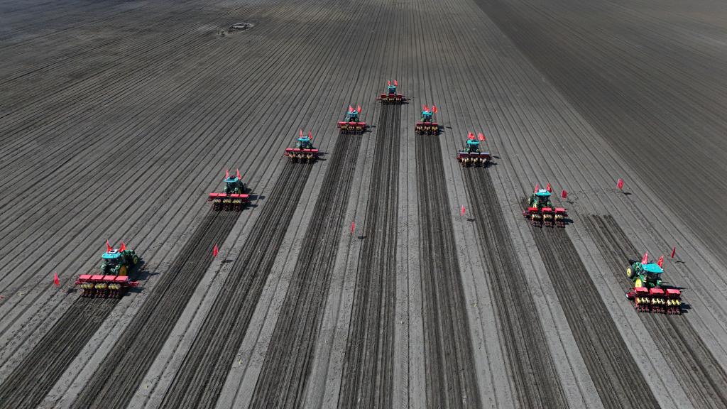 2025年5月8日,在黑龙江双鸭山一旱田地块,大马力农业机械准备在黑土地上进行大豆播种作业(无人机照片)。新华社记者 王松 摄