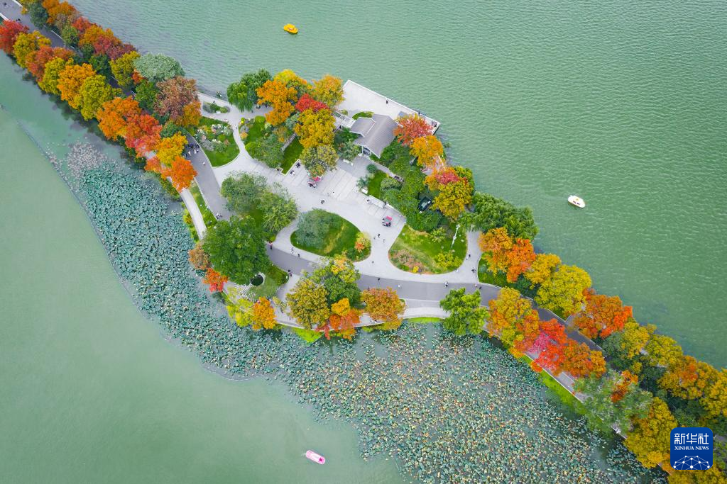 10月25日,游客在南京玄武湖公园观赏秋景(无人机照片)。