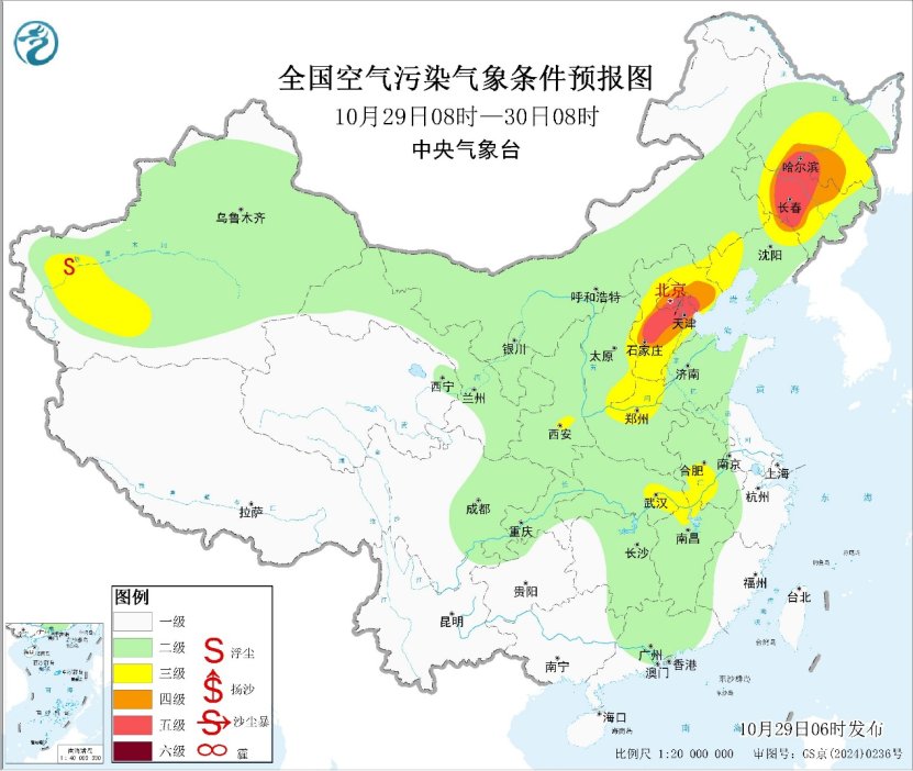 气象监测显示,今晨,河北中南部、北京、天津东部、河南北部、陕西北部、甘肃南部等地部分地区出现大雾天气,局地能见度不足500米。预计今晨至上午,北京、天津、河北、甘肃东部、陕西中北部、河南北部、山东西北部、湖北中西部、贵州东部和西部、湖南北部等地部分地区有大雾天气,其中北京南部、天津北部、河北中南部、河南北部等地的部分地区有能见度不足500米的浓雾,局地有能见度不足200米的强浓雾。明日,受冷空气影响,上述地区霾天气自北向南逐渐减弱或消散。