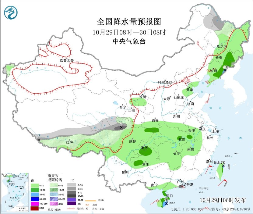 人民网北京10月29日电 (温璐、高清扬)据中国气象局消息,昨日,西藏东部、川西高原北部、青海南部等地出现小到中雪或雨夹雪,局地大雪。预计本周内,青藏高原东部仍多雨雪天气,西藏南部和中东部、青海南部、川西高原北部等地的部分地区有中到大雪或雨夹雪,局地有暴雪或大暴雪;此外,今明两天,西北地区东部、华北南部、东北地区中南部、黄淮、江汉、江南及西南地区、海南岛有小雨,部分地区有中到大雨、局地暴雨;内蒙古东北部、黑龙江北部、吉林东部的部分地区有小到中雪或雨夹雪、局地有大雪。