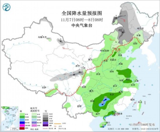 11月7日8时至8日8时,内蒙古中东部、东北地区西部、青海南部、河北北部等地部分地区有小到中雪或雨夹雪,其中,内蒙古东部等地局地有大雪(5~9毫米)。河北中部、安徽中北部和东南部、江苏中北部、湖南中西部和南部、江西中部、贵州东部、广西中北部、广东西南部、海南岛东部和南部等地部分地区有中到大雨,局地有暴雨(50~80毫米)。新疆东部、内蒙古大部、黑龙江东北部、甘肃河西等地部分地区有5~6级风、局地7~8级;南海中西部和西南部、北部湾、台湾海峡、渤海等部分海域将有4~6级风、阵风7级。