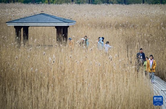 11月15日,游客漫步在北京园博园的一片芦苇荡中。