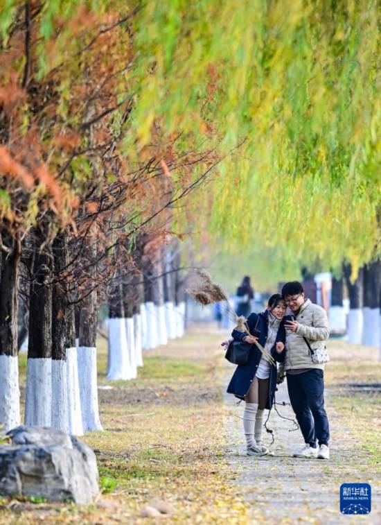 初冬时节,北京园博园内树木色彩斑斓,不少市民趁着周末来到这里,或散步赏景,或静坐小憩,享受一段惬意的休闲时光。