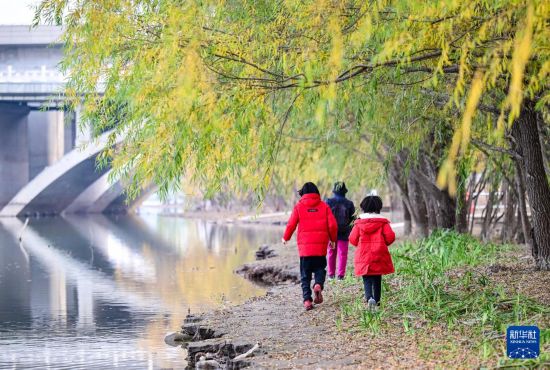 11月15日,游客走在北京园博园内的永定河边。