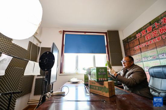 11月20日,在天津市西青区辛口镇一家萝卜专业合作社,农户在直播推广沙窝萝卜。