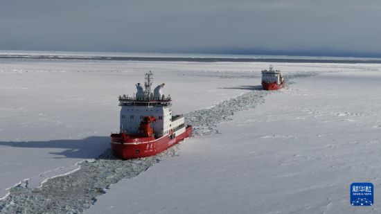 12月5日,“雪龙2”号(前)在为“雪龙”号破冰引航(无人机照片)。