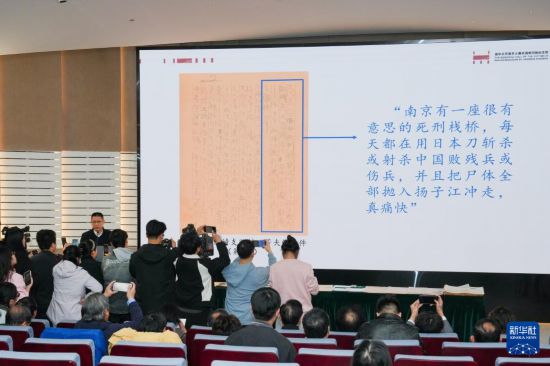 12月5日,侵华日军南京大屠杀遇难同胞纪念馆的工作人员在活动现场介绍2025年新征文物史料相关情况。