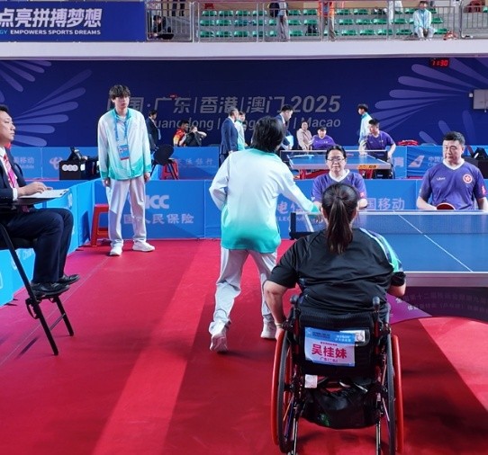 球场上残疾人运动员们挥洒着汗水,用高超的球技彰显着生命的不屈力量;而在球桌旁,志愿者们也跟随比赛节奏,协助运动员们取得傲人佳绩。