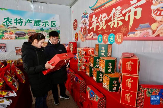 2月3日,游客在宁夏固原市西吉县年货大集上选购年货产品。