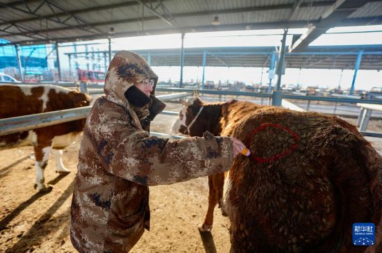 2月4日,经纪人在单家集活畜交易市场给肉牛做标记。