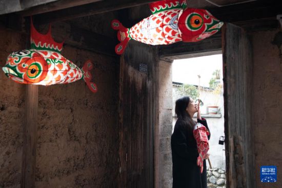2月7日,在安徽省黄山市黟县碧山村,游客在当地民居门前手持鱼灯留影。