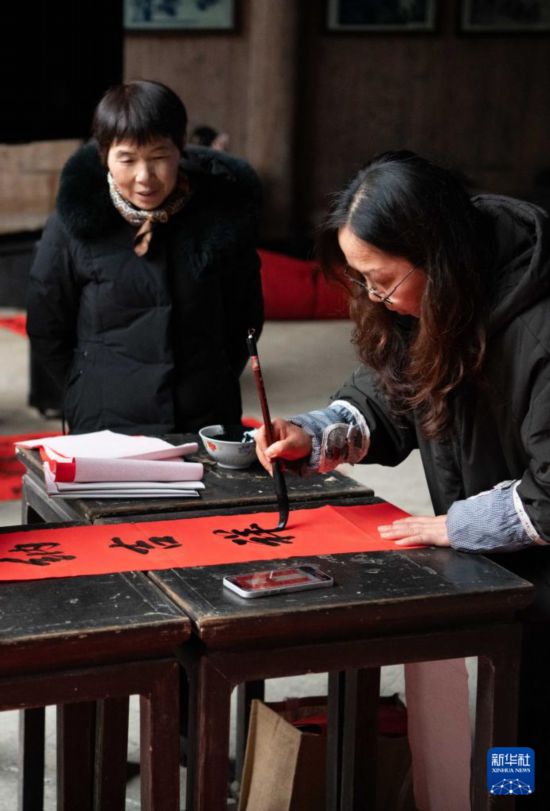 2月6日,在安徽省黄山市黟县南屏村,村民参加写春联活动。