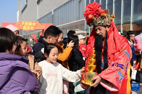 2月7日,社火表演者(右一)在活动现场与观众互动。