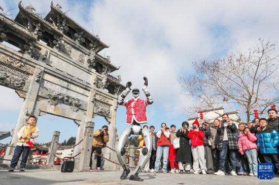 2月18日,游客在安徽省黟县西递古村观看机器人表演。