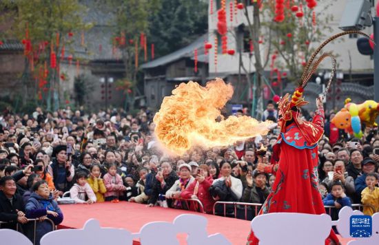 2月18日,游客在四川省资中县青云广场观看川剧演员表演吐火。