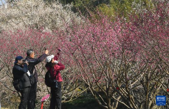 春节期间,浙江杭州西溪湿地梅花进入盛花期,吸引游客前来踏春赏花。