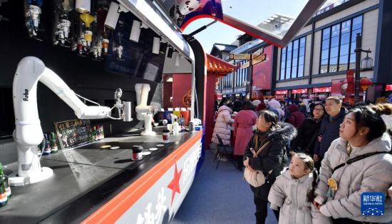 2月18日,北京隆福寺新春市集内的机器人饮料调配师吸引游客驻足。
