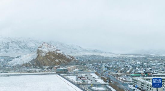 3月13日,空中俯瞰雪后的西藏日喀则市江孜县江孜宗山古堡(无人机照片)。