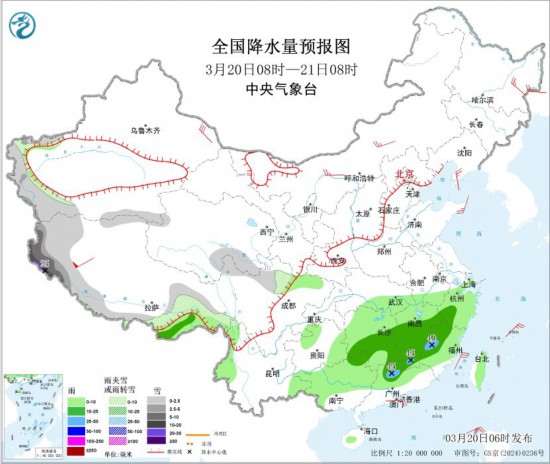 3月20日08时至21日08时,新疆南疆西部山区、西藏西部和南部、青海南部、川西高原北部等地部分地区有小到中雪或雨夹雪,其中,西藏西部等地部分地区有大到暴雪,局地大暴雪(20~25毫米)。贵州东部、江南大部、华南北部和西部、海南岛中部、台湾岛东部等地部分地区有小到中雨,其中,江西南部、福建西部、广东西北部等地部分地区有大雨(25~45毫米)。新疆东部、内蒙古中西部、黑龙江东部、辽东半岛、山东半岛等地部分地区有4~6级风,西藏南部部分地区有7~8级风;台湾海峡将有5~6级风、阵风7级。