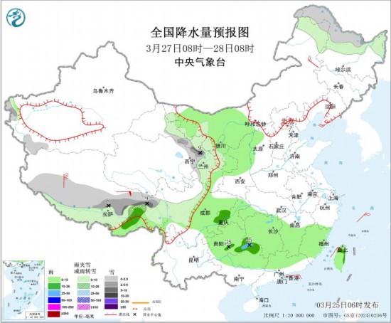 3月27日08时至28日08时,新疆南疆西部山区、西藏南部、川西高原中部、内蒙古西南部和东北部、黑龙江中北部、甘肃河西、宁夏南部等地部分地区有小到中雪或雨夹雪,其中,西藏东南部、甘肃河西等地部分地区有大雪(5~9毫米);内蒙古西部、西藏东南部、四川盆地、重庆、贵州、陕西中北部、江南大部、湖北西南部、华南北部、台湾岛等地部分地区有小到中雨,其中,湖南西南部、贵州南部等地部分地区有大雨(25~45毫米)。内蒙古东北部、辽东半岛等地部分地区有4~6级风,西藏东部地区有7~8级风。