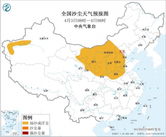 全国沙尘天气预报图(4月3日08时-4日08时) 。图片来源:中央气象台网站
