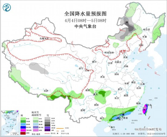 全国降水量预报图(4月4日08时-5日08时) 。 图片来源:中央气象台网站